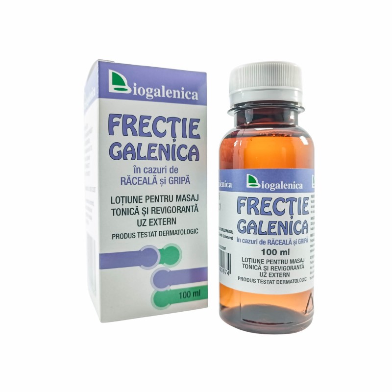 FRECTIE GALENICA – LOTIUNE PENTRU MASAJ TONICA SI REVIGORANTA 100 ml – UZ EXTERN PRODUS TESTAT DERMATOLOGIC INGREDIENTE : nicotinat de metil, mentol, camfor, ulei esential de lavanda, ulei esential de eucalipt, tinctura de ienupar, alcool izopropilic, apa purificata.